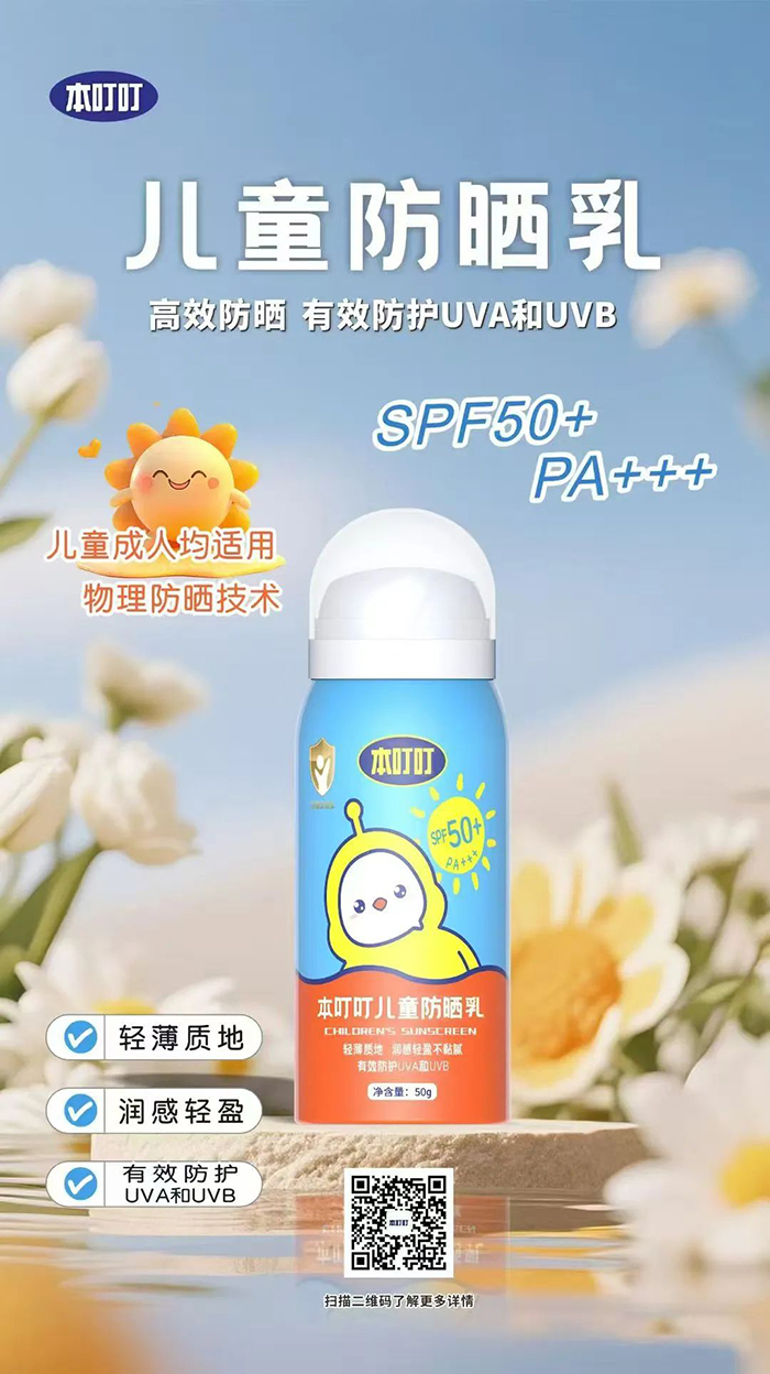 冷知识:儿童单位皮肤接受的紫外线量是成人的3倍! 选对防晒,就是守护宝贝未来的肌肤健康!本叮叮防晒乳——物理防晒黑科技,轻薄水感,宝宝主动伸手涂的防晒乳~